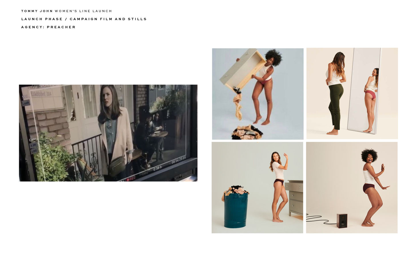 Turn a successful men's underwear brand into a unisex brand by launching Tommy John's Women’s Line. BUSINESS OBJECTIVE Establish a new division of business for Tommy John and, in doing so, acquire a new customer base. CHALLENGE Develop a cohesive brand strategy and creative direction for the Women’s Line that maintains Tommy John's signature ballsy humor without being crass or vulgar. This challenge encompassed tone of voice, website user experience, casting, and creative content across multiple channels, all while integrating the new product line into the existing brand identity. RESULT Successfully launched the Women’s Line, with projected inventory selling out in six weeks post-launch, and established a new campaign calendar that seamlessly integrated men's, women's, and couples' collections, setting the stage for continued brand growth and success.